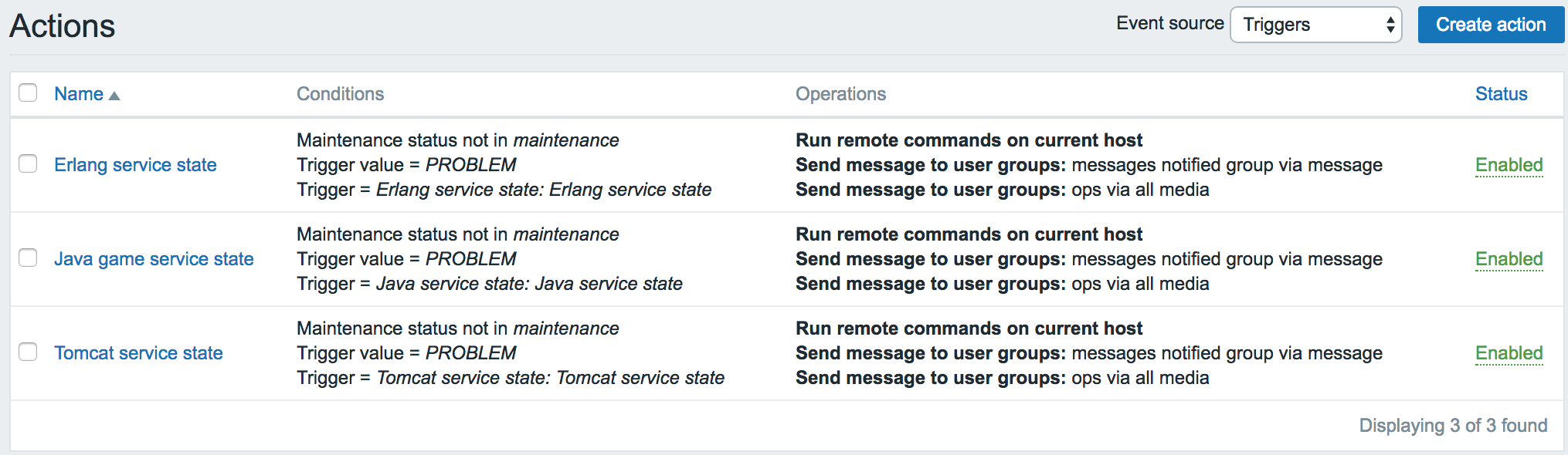 根据 Triggers 配置 Actions,某个 Triggers 被触发了执行什么操作,我一般是先执行故障恢复(重启服务或者其他操作),多次执行故障恢复失败之后(一般两次)就会执行告警操作,根据时间和严重级别去通知某些组和某些人。我之前用的是微信通知,后面发现微信有时候我自己都无法及时收到,就改成了短信。