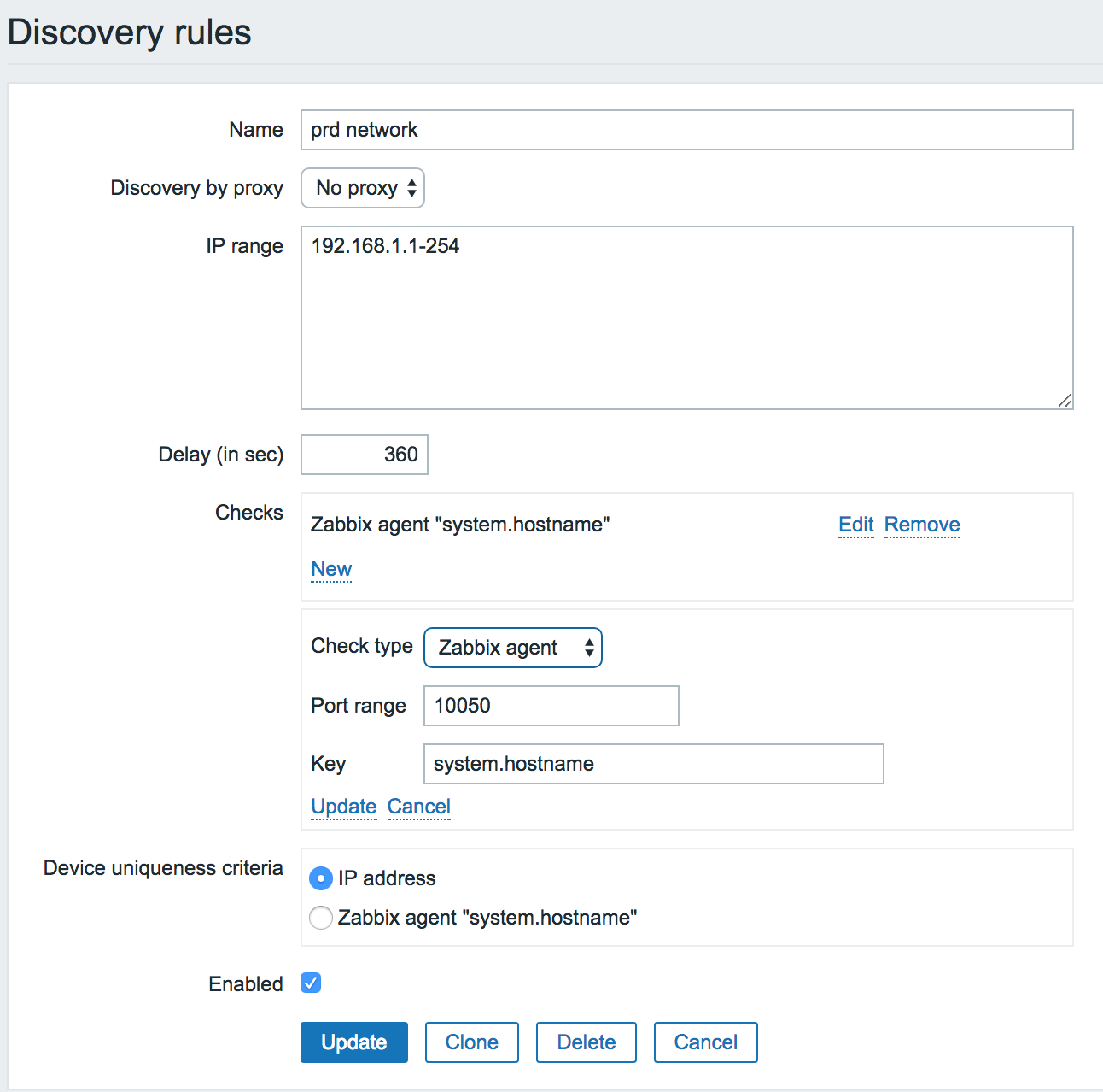 主要是 ip range 和 Checks type ,ip range 根据自己的服务器所属的网段填,Checks type 选择 Zabbix agent,如果想监控路由器或者交换机等设备的话,也可以使用 SNMP 协议相关的项目。
