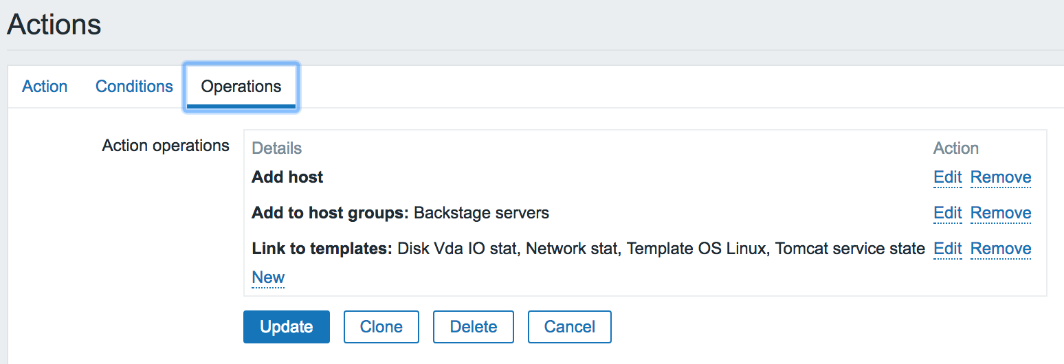 如果上面的 Conditions 满足条件,那么这里的 Operations 就会被触发,Add host 是必须的,再就是 Link to templates (链接模版),之前创建的 Template 就可以用在这里,比如上图就链接了 Disk Vda IO stat, Network stat, Template OS Linux 这些公用模版,还链接了 Tomcat service state 这个后台 Tomcat 服务器专用模版,而且触发器、故障恢复机制、告警机制全部都链接到了这个模版上。